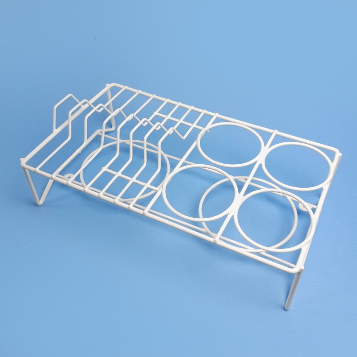 Sturdy white PVC-coated wire rack designed to safeguard 4 dinner plates, 4 side plates and 4 cups against movement and breakage during caravan or motorhome travel. Compact and lightweight for easy kitchen storage, it provides organised, ventilated holding to keep crockery secure and dry, ideal for compact living spaces on the road.